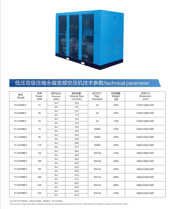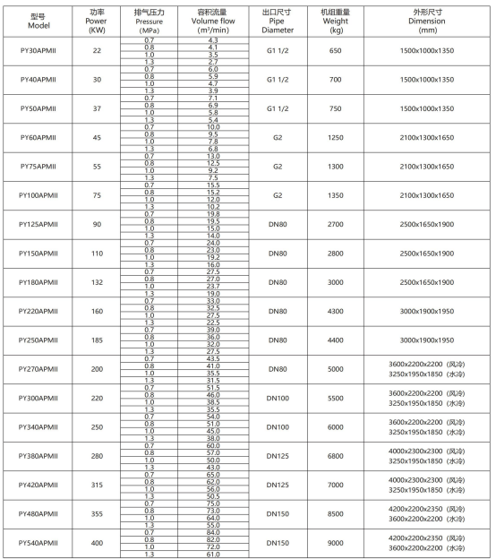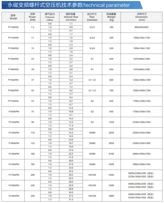 Below is a product model, specification, and parameter table to simplify micro-oil permanent magnet variable frequency screw air compressor selection: